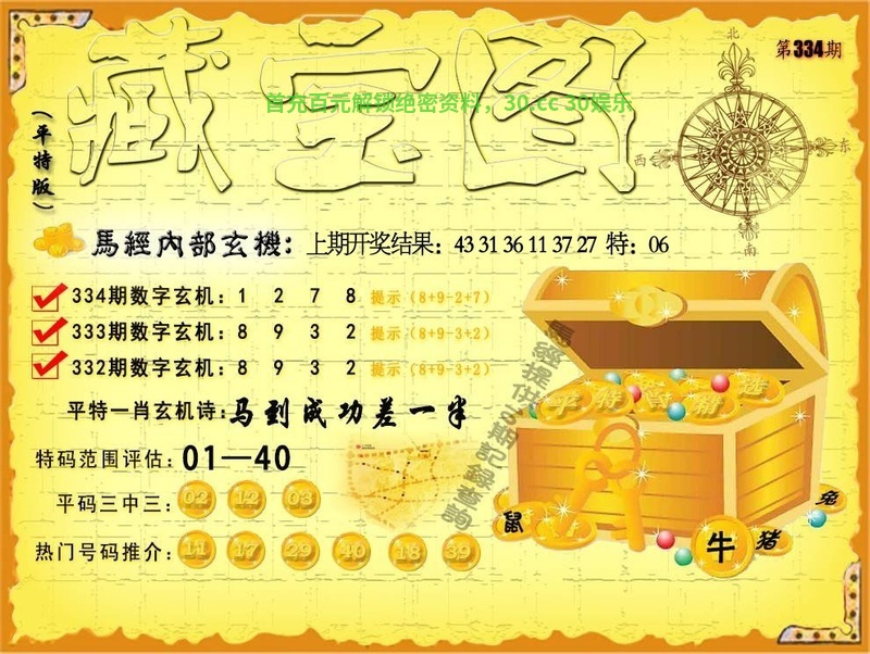 334期:平特藏宝图玄机:【马到成功差一半】 解:马到成功差一半,解牛,平特牛 推荐平码:11.17.29.40.18.39 开奖结果:35.29.41.33.01.49T46 |